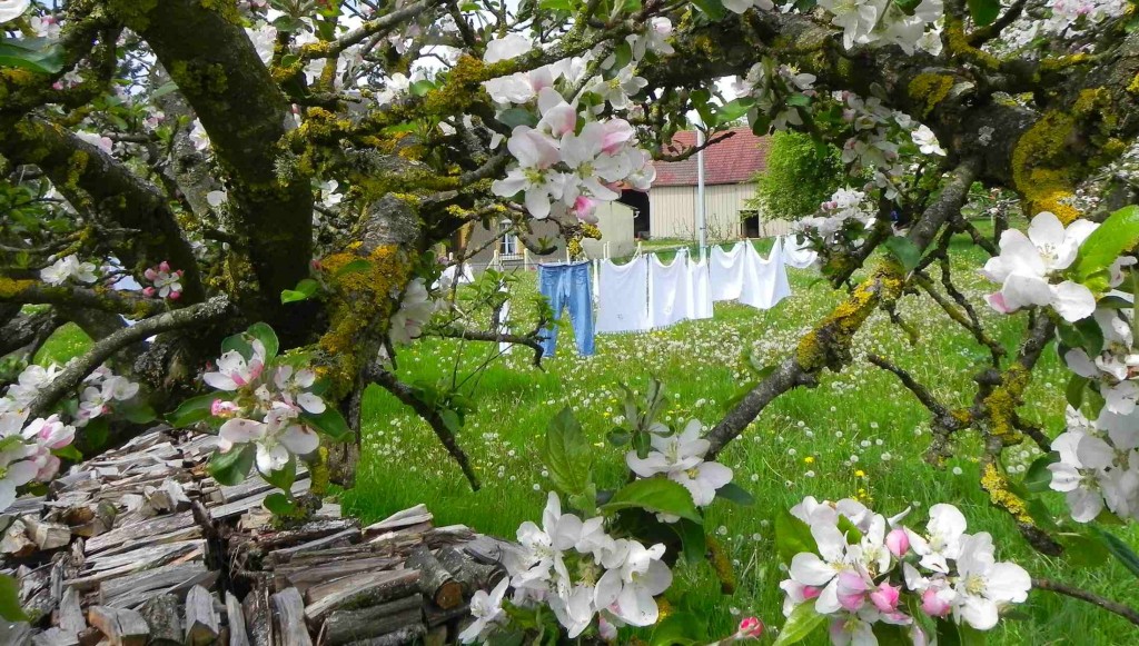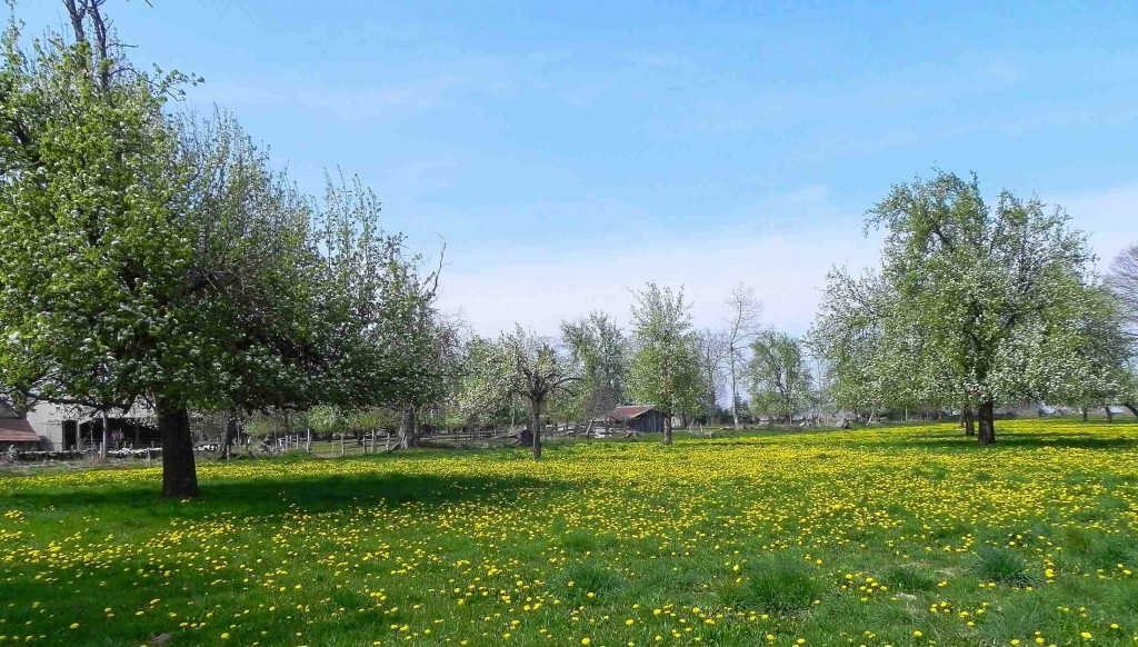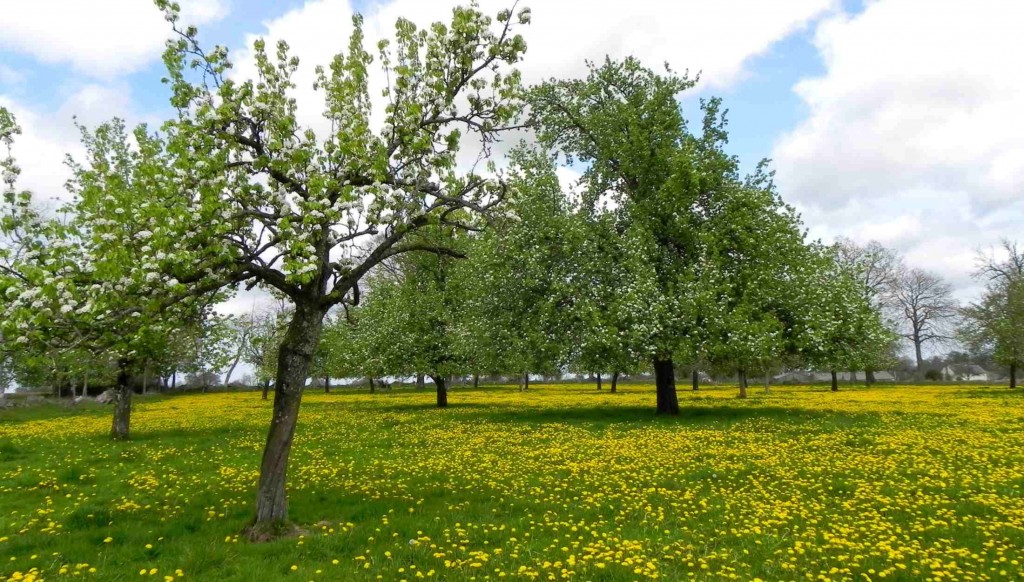 C’est-à-dire, une maison entourée de son verger, où pommiers et poiriers font un heureux mélange de couleurs.