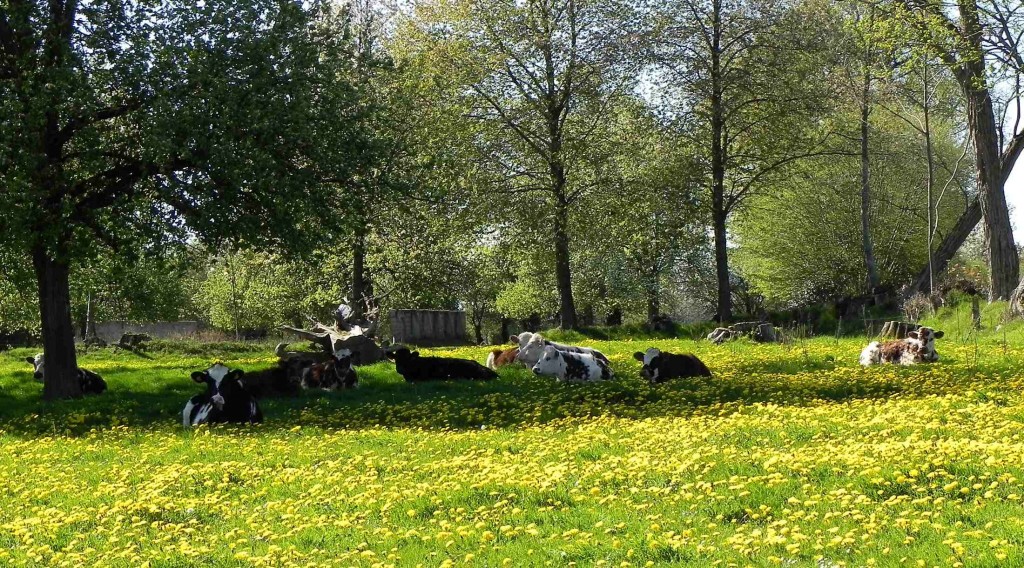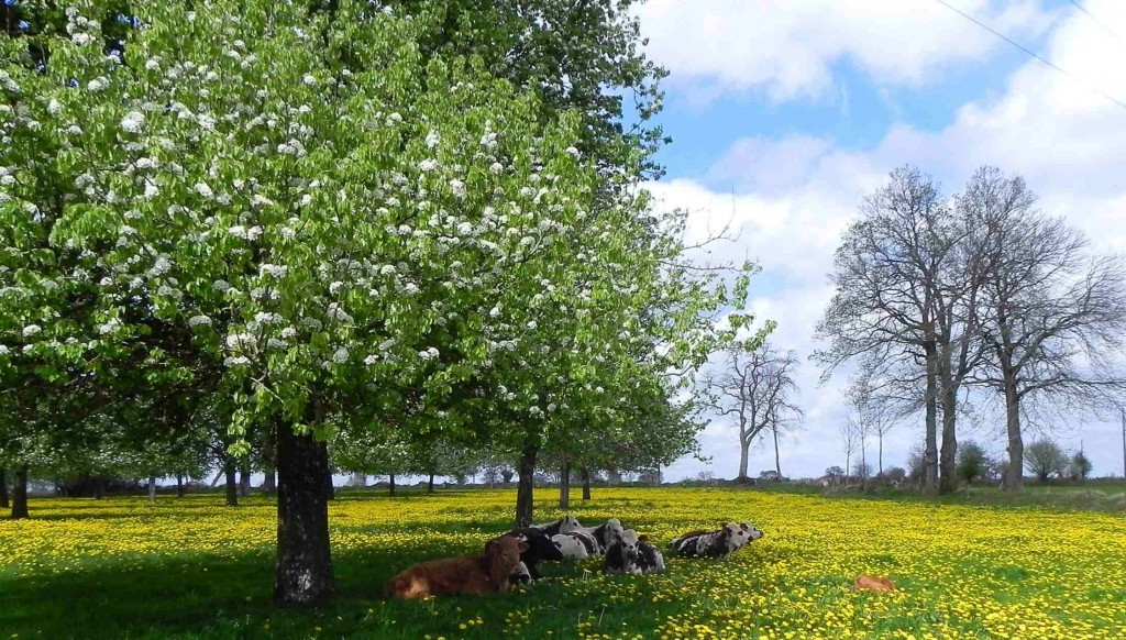 L’étable n’avait pas l’allure des stabules actuelles, usines à vaches, puisque le bétail passait la plupart de son temps dans les pâturages, à se nourrir de cette herbe qui est bien la marque de cette région ! Herbe grasse, colorée au printemps par les milliers de fleurs de pissenlit. Les pommiers et poiriers étaient, en plus, taillés à hauteur par l’attrait que suscitait les pommes où poires qui pouvaient être atteintes, la gourmandise de ces belles Dames des champs (..Humm : les vaches !! )..